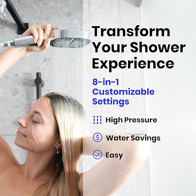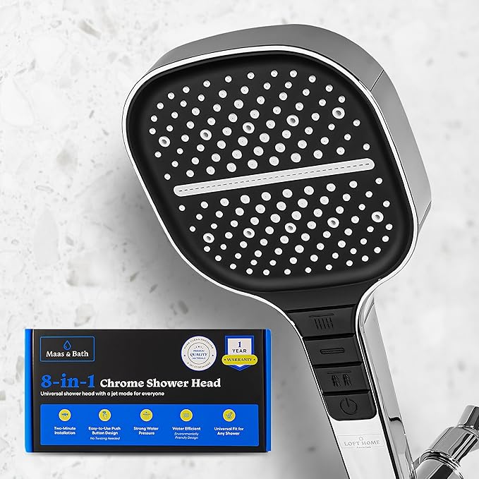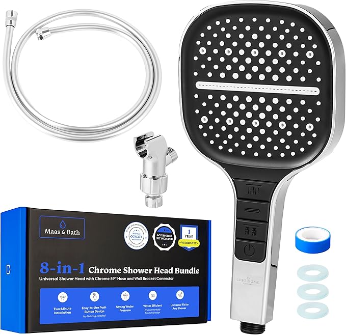 Elevate your daily shower into a luxurious escape with the Maas & Bath 8-in-1 Chrome Shower Head. This complete handheld shower head kit includes a sleek, modern square shower head, a flexible hose, and a sturdy bracket—engineered to deliver high water pressure, customizable spray patterns, and smart water-saving technology in one elegant design.